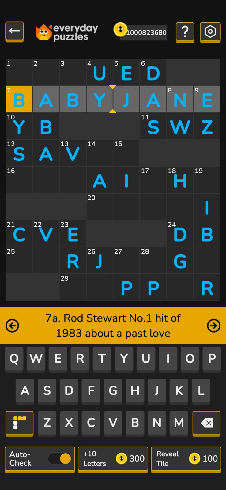 For example, if the clue is "Rod Stewart, 1983 No. 1 hit about a past love", the yellow arrows will show where "Baby" begins and where "Jane" ends, forming Baby Jane.